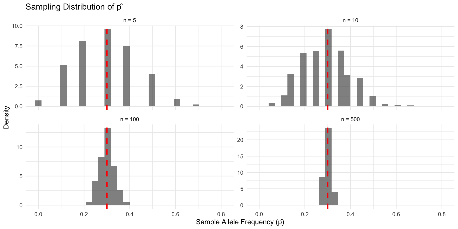 As a consequence, the genotype frequencies in a random sample of n individuals are approximately multinomially distributed with cell probabilities (p^2, 2pq, q^2). Thus, the sampling error of \hat{p} is approximately \sqrt{p(1-p)/2n}.