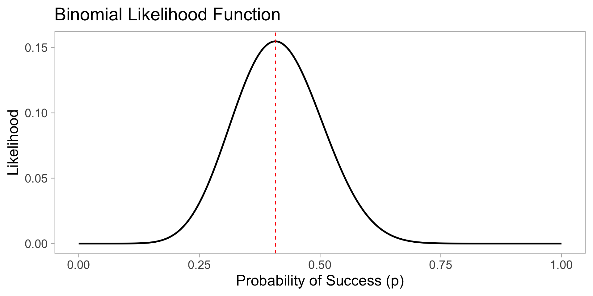 n <-27x <-11p_seq <-seq(0, 1, length.out =200)likelihood <-dbinom(x, n, p_seq)plot <-ggplot(data.frame(p = p_seq, likelihood = likelihood),aes(x = p, y = likelihood)) +geom_line(linewidth =1) +labs(x ="Probability of Success (p)",y ="Likelihood",title ="Binomial Likelihood Function" ) +geom_vline(xintercept = x / n,color ="red",linetype ="dashed" ) +theme_light(base_size =18) +theme(panel.grid =element_blank())