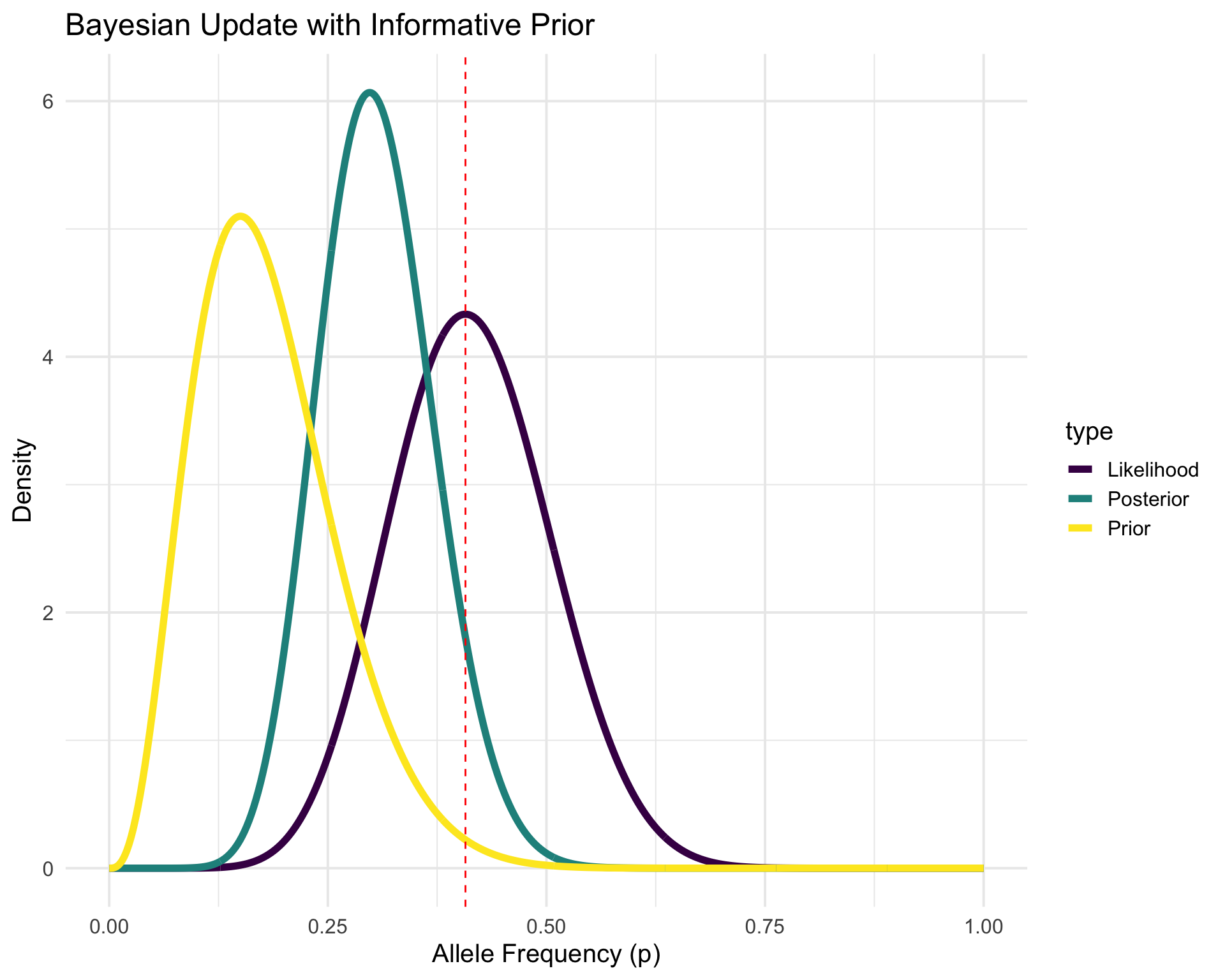 p1 <-ggplot( plot_data %>%filter(scenario =="Informative"),aes(x = p, y = density, color = type)) +geom_line(linewidth =2) +geom_vline(xintercept =11/27, linetype ="dashed", color ="red") +labs(x ="Allele Frequency (p)",y ="Density",title ="Bayesian Update with Informative Prior" ) +scale_color_viridis_d() +theme_minimal(base_size =15)