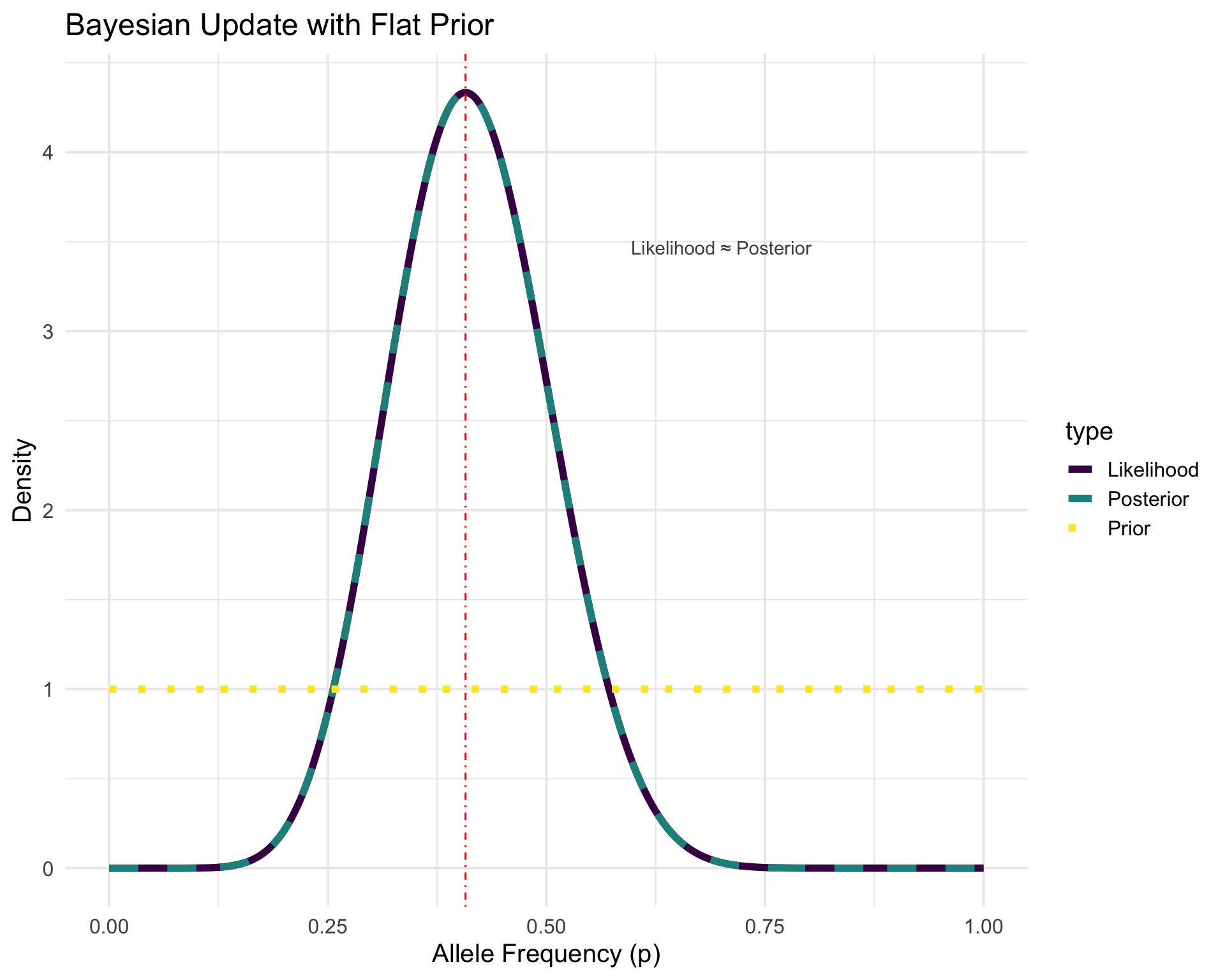 p2 <-ggplot( plot_data %>%filter(scenario =="Flat"),aes(x = p, y = density, color = type, linetype = type)) +geom_line(linewidth =2) +scale_linetype_manual(values =c("Prior"="dotted", "Likelihood"="solid", "Posterior"="dashed")) +geom_vline(xintercept =11/27, linetype ="dotdash", color ="red") +labs(x ="Allele Frequency (p)",y ="Density",title ="Bayesian Update with Flat Prior" ) +theme_minimal(base_size =15) +scale_color_viridis_d() +annotate("text",x =0.7, y =max(flat_posterior) *0.8,label ="Likelihood ≈ Posterior", color ="gray30" )