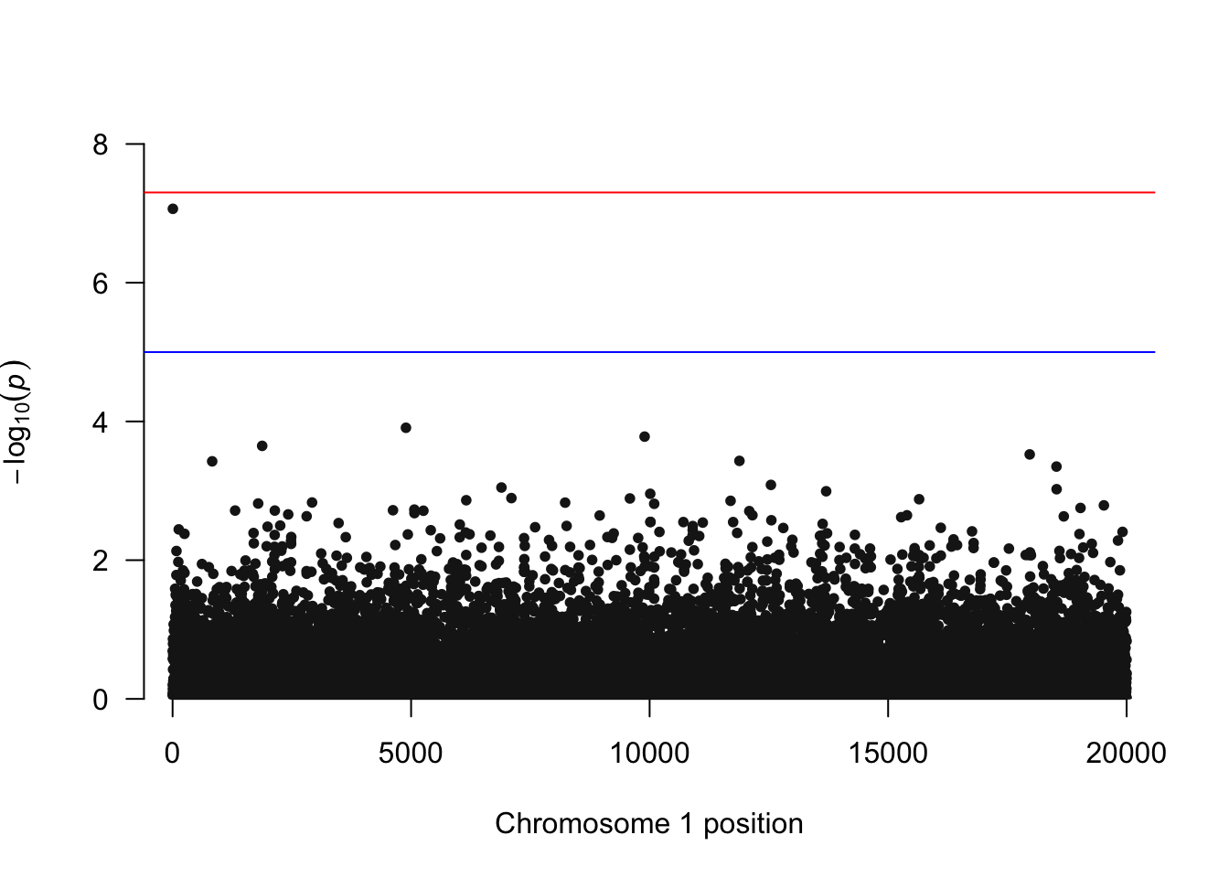 We visualize the genome‑wide p-values using a Manhattan plot. The blue line indicates a p-value threshold of 1 \times 10^{-5}. Note that this is equivalent to a Bonferroni correction for 5,000 independent tests. The red line at 5 \times 10^{-8} is a common genome‑wide significance threshold for GWAS, though it is conservative for smaller studies or those with fewer variants.