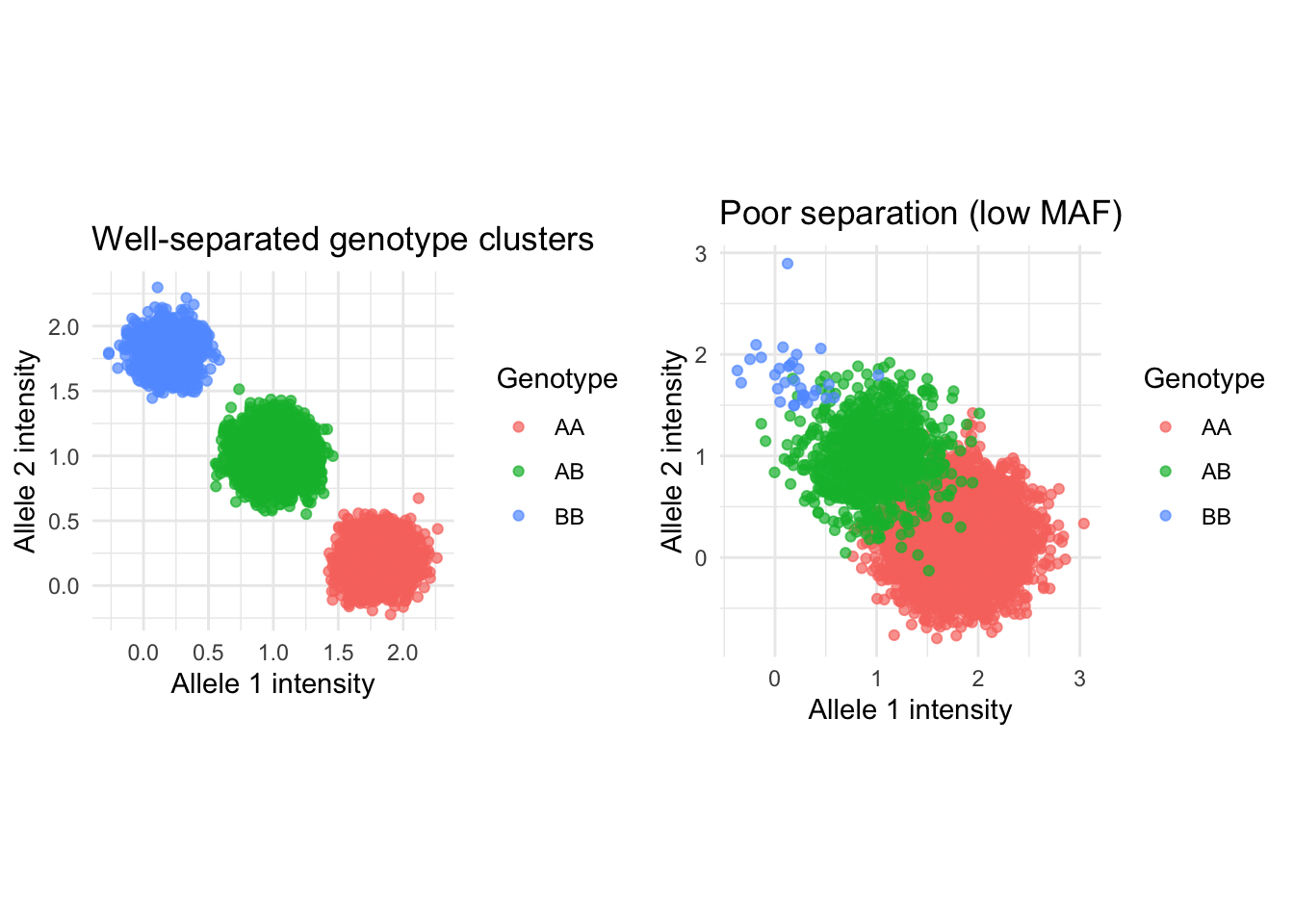 - When MAF is low, genotype clusters can overlap, leading to genotyping errors
