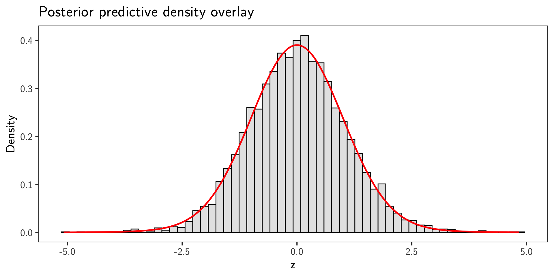 Overlay the posterior mean predictive density on the \(z\) histogram.