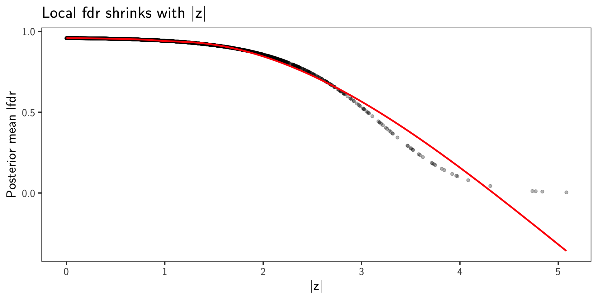 Our Stan model returns lfdr in generated quantities. Compute posterior means \(\hat{\operatorname{lfdr}}_i\) and visualize.
